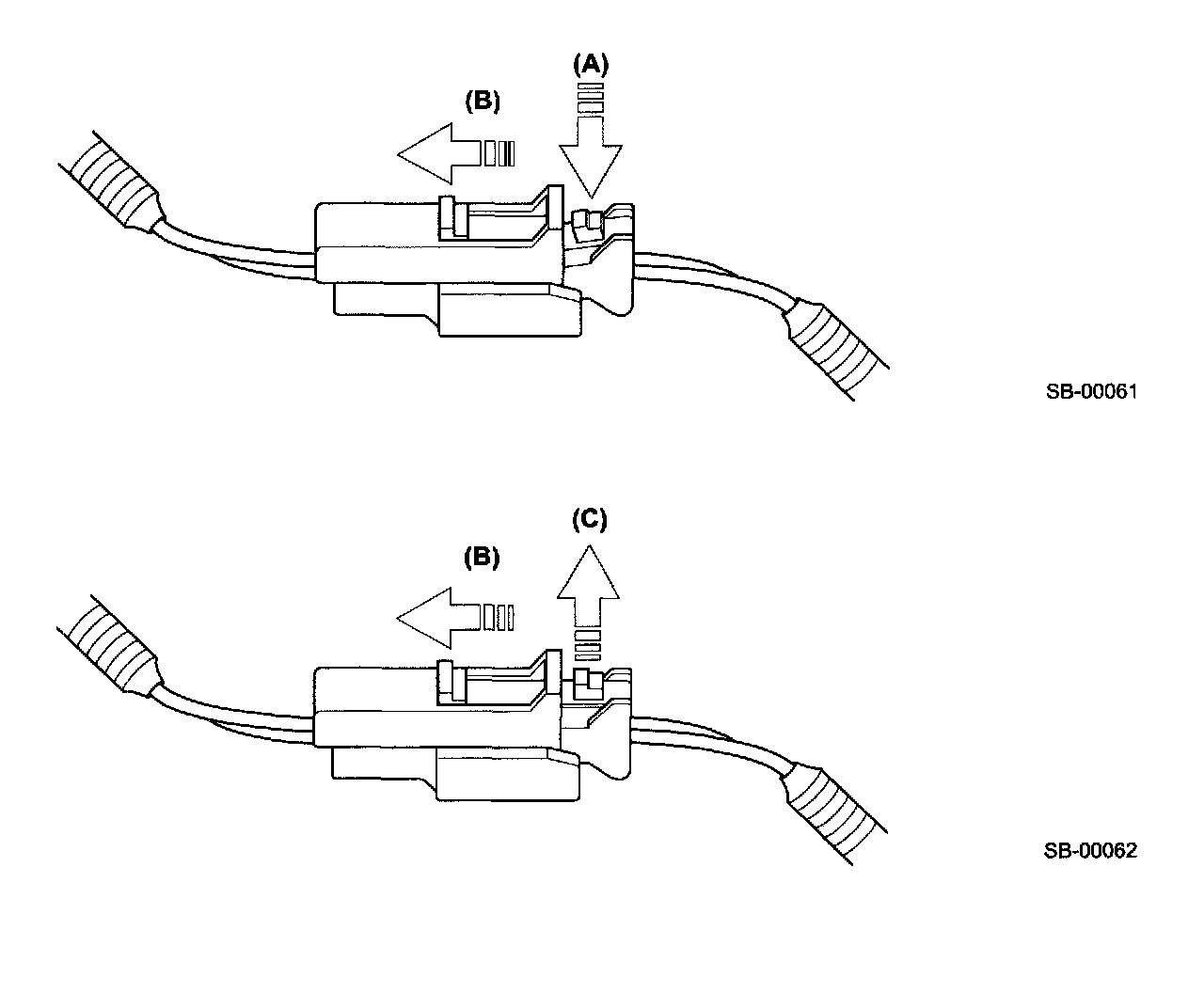 PRETENSIONER CONNECTORDisconnection: Hold slide lock moved in the direction of the arrow (B), then pull out the connector.