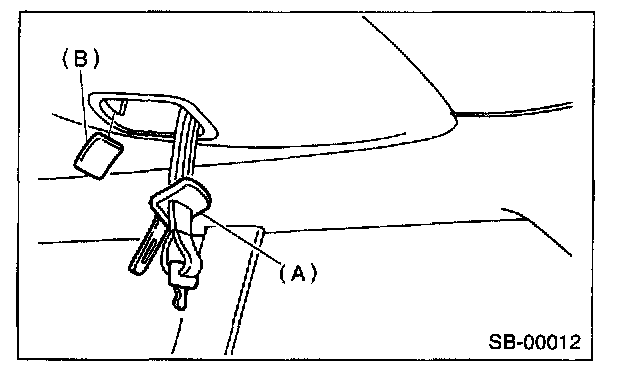 7. Remove the cover (B) while detaching snap lock carefully. Put the outer belt center tongue (A) out to the other side of the trim through the hole.