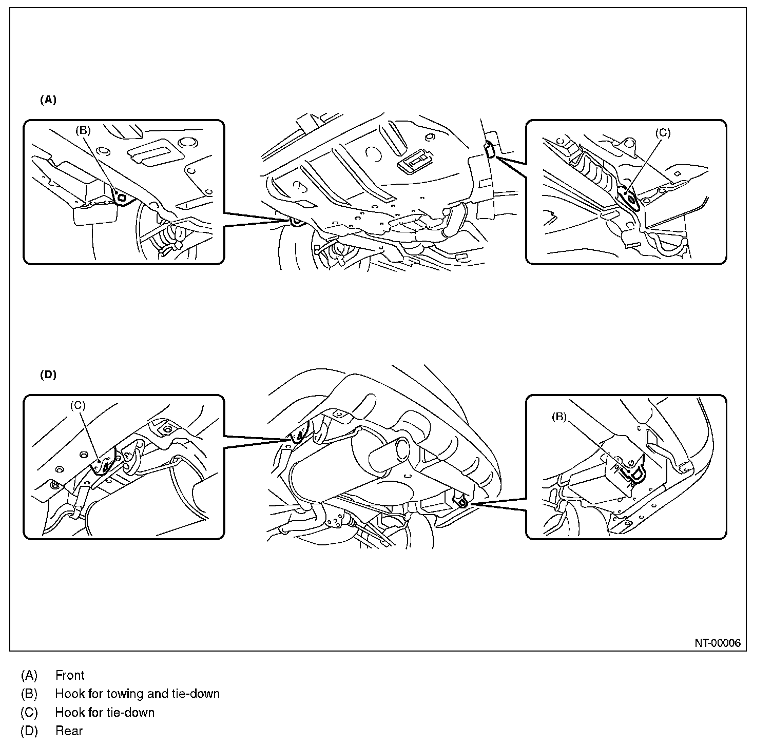 - Do not tow other vehicles with a front hook for tie-down.