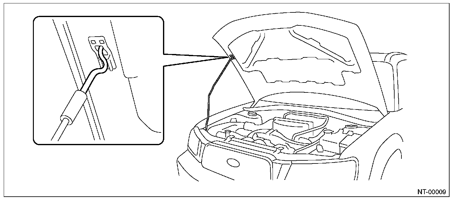 NOTE: Before setting the front hood in this position, remove the windshield washer hose attaching clip from the front hood.