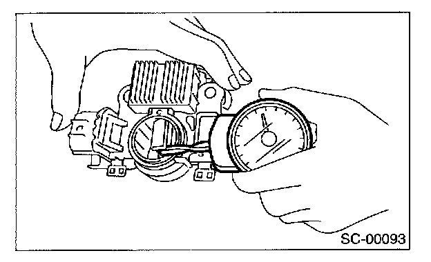 2. Checking brush spring for proper pressure Using a spring pressure indicator, push the brush into the brush holder until its tip protrudes 2 mm (0.08 in). Then measure the pressure of brush spring. If the pressure is less than 2.2 N (224 g, 7.91 oz), replace the brush spring with a new one. The new spring must have a pressure of 4.8 to 6.0 N (489 to 612 g, 17.26 to 21.60 oz).