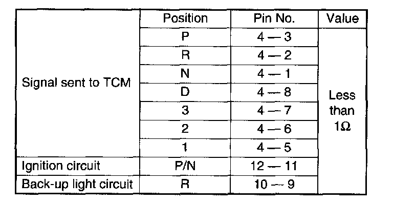Also check that continuity in ignition circuit does not exist when the select lever is in "R", "D", "3", "2" and "1" ranges.