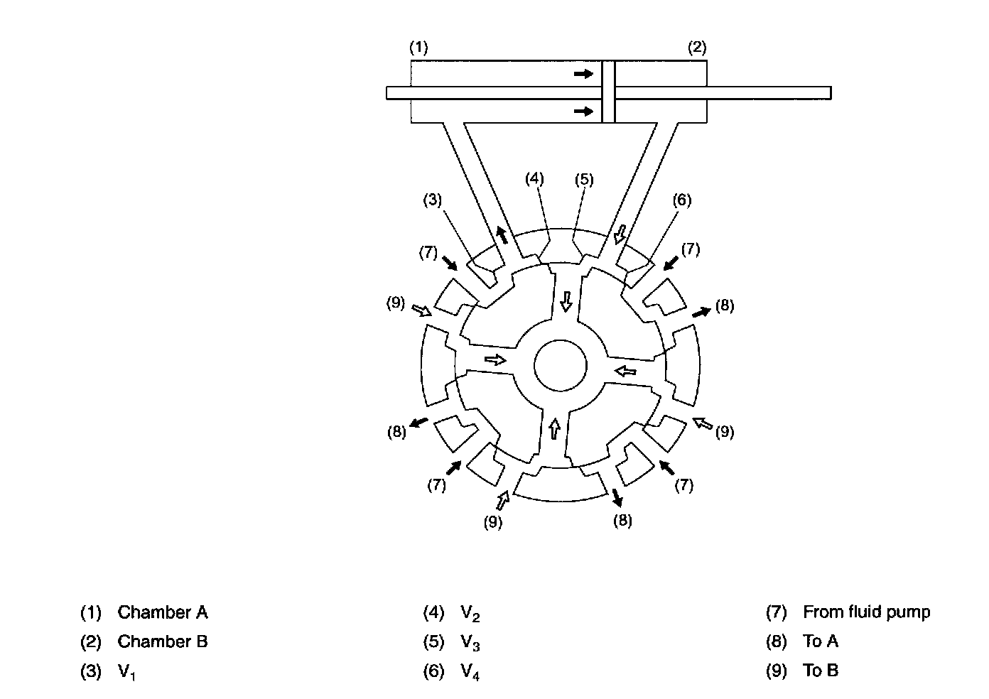 When the steering wheel is turned to the right, for example, fluid passages V, and V3 are opened while fluid passages V2 and V4 are nearly closed.