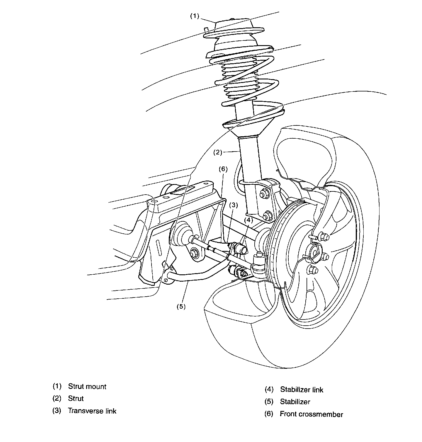 The transverse link is an "L" shaped arm design to increase steering stability and reduce road noise. The transverse link has a maintenance-free ball joint fitted by a castle nut at its outer end. The front of the link's inner end is fitted to the front crossmember through a rubber cushion and the rear of the inner end is bolted to the vehicle body through a fluid-filled bushing.