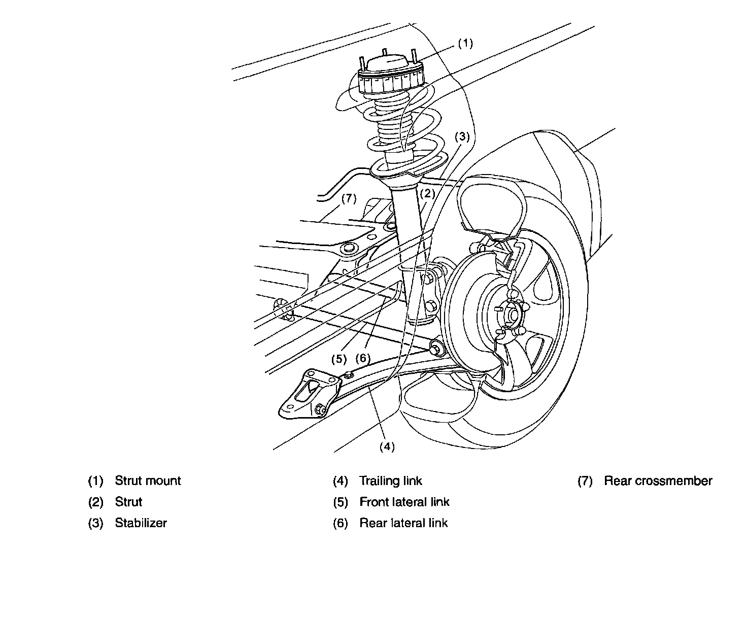 The rear suspension is an independent, dual link strut type. The suspension on each side consists of two parallel arranged lateral links, a trailing link, and a strut assembly. The strut assembly consists of a cylindrical double-acting low pressure gas and oil-filled damper and coil spring.