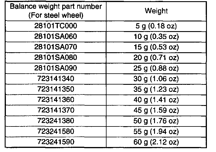 Weight for steel wheel; 5 grams (0.18 ounces) - 25 grams (0.88 ounces) 2.0 mm (0.079 inch) 30 g (1.06 ounces) 1.8 mm (0.071)
