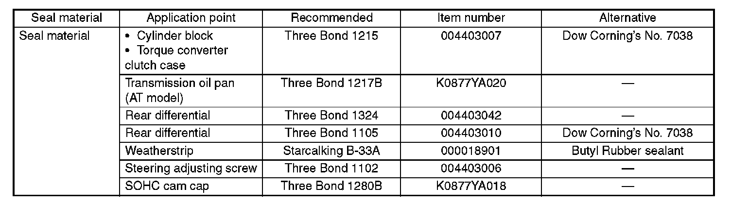 Use seal material shown in the table, or equivalent.