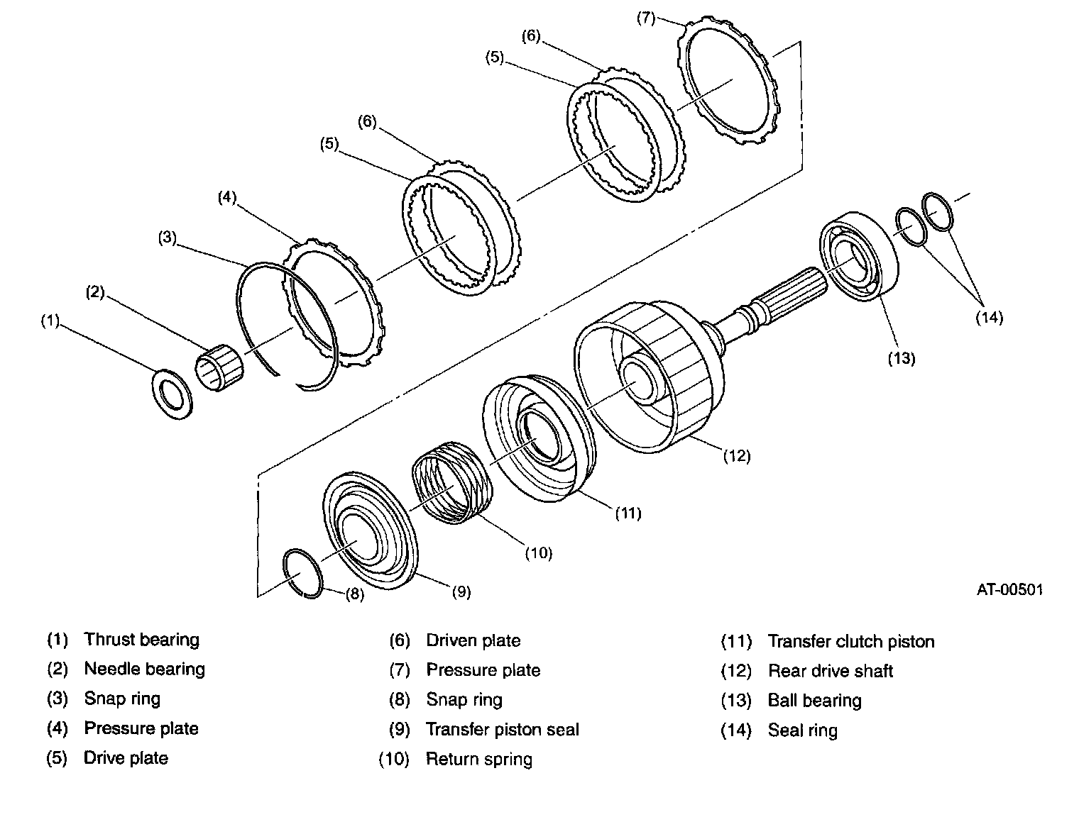 This All-Wheel-Drive (AWD) transfer system uses an electronically controlled multi-plate type transfer clutch. The clutch is controlled by the TCM through the transfer hydraulic pressure control unit which consists of a duty-cycle-controlled solenoid valve and is located at the rear of the automatic transmission section together with the vehicle speed sensor.