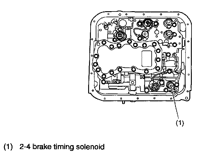 This solenoid is mounted on the transmission hydraulic control valve body. It is turned ON or OFF according to signals from the TCM. It then controls the 2-4 brake timing valve B to decrease the change gear shock.