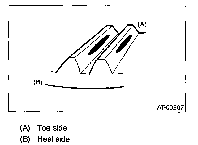 Checking item: Tooth contact pattern is slightly shifted toward to toe side under no-load rotation. [When loaded, contact pattern moves toward heel.]