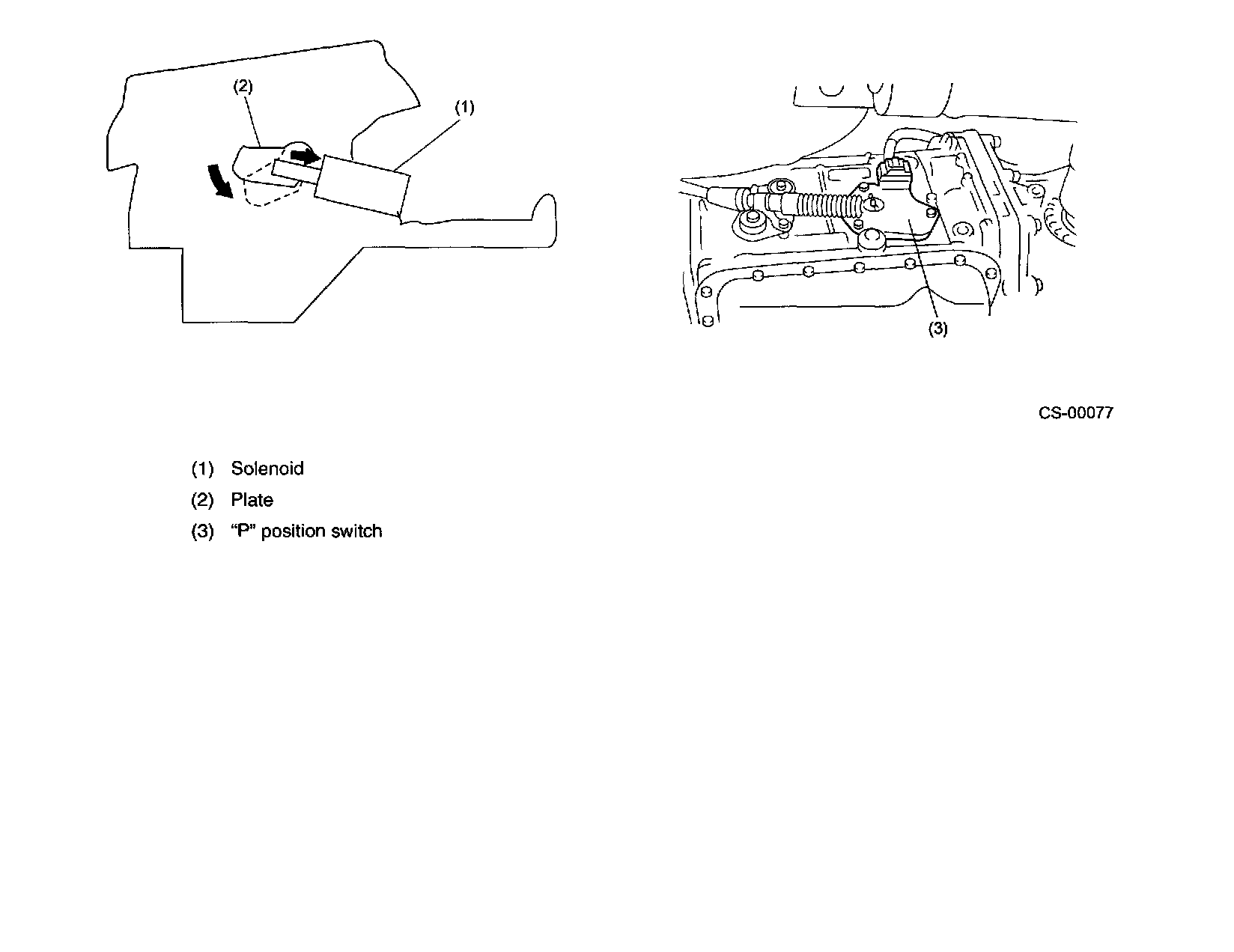 The shift lock system has a solenoid-operated plunger (1). With the select lever in the "P" position, the plunger remains extended, holding the plate (2) in its raised (locking) position. When the brake pedal is depressed with the ignition switch in either the ON or START position, the solenoid is energized and the plunger is retracted. This causes the plate to tilt downward to the select lever release position. The select lever now can be moved to any other position. The "P" position of the select lever is detected by the inhibitor switch (3).
