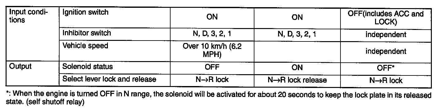 1) When the ignition switch is ON (select lever in N, D, 3, 2 or 1 range) and the vehicle speed is below 10 km/h (6.2 MPH), the solenoid is activated moving the lock plate to release the N-R lock, thus reverse speed can be selected.