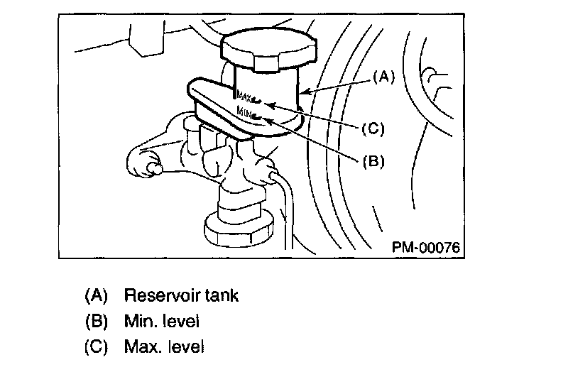 2. Inspect the fluid level using scale on the outside of the reservoir tank. If the level is below "MIN", add fluid to bring it up to "MAX", and also inspect for leakage.