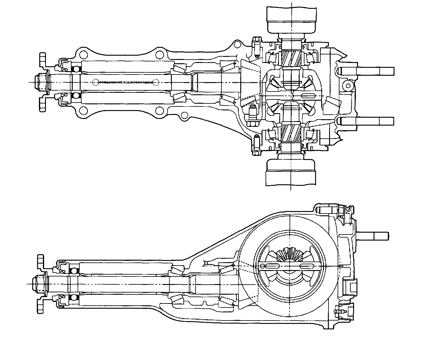 Rear DifferentialThe drive gear is a hypoid gear with a nominal diameter of 160 mm (6.30 inch). The drive pinion shaft is supported by three bearings. The bearing preload is adjusted by selecting a spacer and washer combination of a proper thickness. The drive pinion height is adjusted by properly selecting the thickness of the washers located at the drive pinion neck using Dummy Shaft and Gauge.