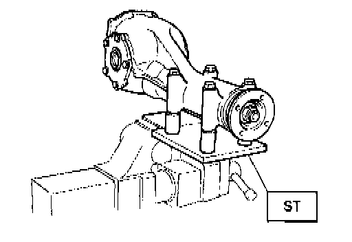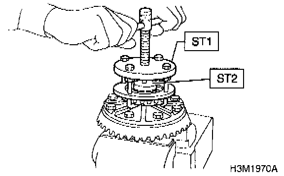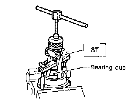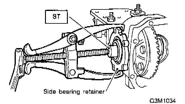 5. Make right and left side bearing retainers in order to identify them at reassembly. Remove the side bearing retainer attaching bolts, set the ST to differential case, and extract right and left side bearing retainers with a puller.