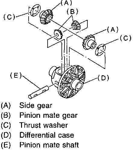 13. Draw out the pinion mate shaft and remove the pinion mate gears, side gears and thrust washers. (Without LSD)