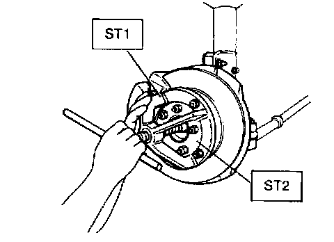9. Remove the front drive shaft from front axle. If it is hard to remove, remove the brake disk rotor using the ST1 and ST2.