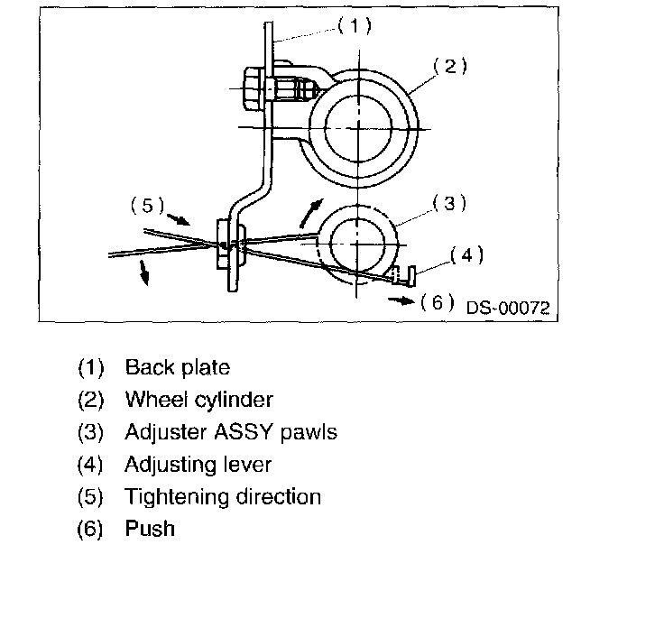 7. If it is difficult to remove the brake drum, remove the adjusting hole cover from back plate, and then turn the adjusting screw using a flat tip screwdriver until brake shoe separates from the drum.
