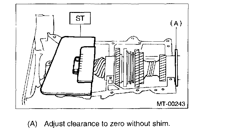 10. Set the transmission main shaft assembly and drive pinion assembly in position. (So there is no clearance between the two when moved all the way to the front). Inspect the suitable 1st-2nd, 3rd-4th and 5th shifter fork so that coupling sleeve and reverse driven gear are positioned in the center of their synchronizing mechanisms.