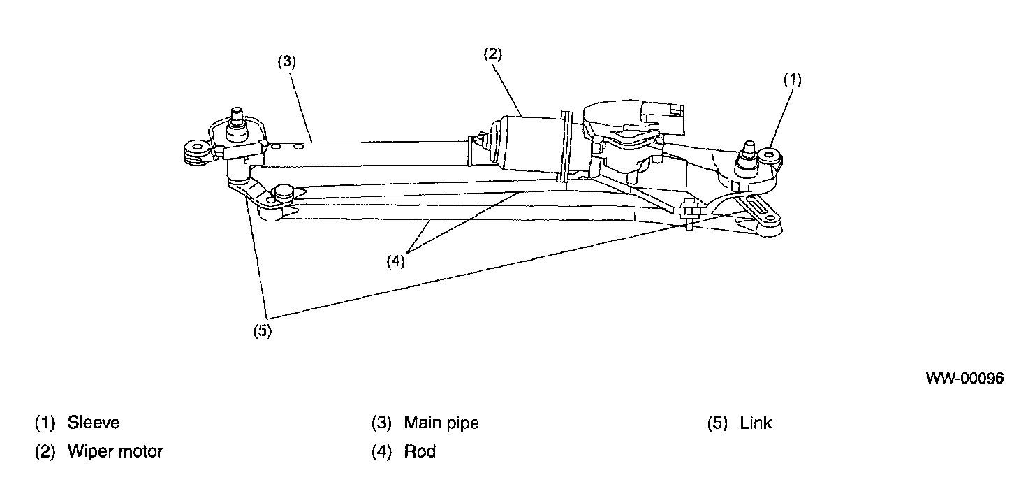 4. The front wiper system uses a modular construction in which the wiper motor forms an integral part of the linkage. The motor is installed on the body through rubber mounting.