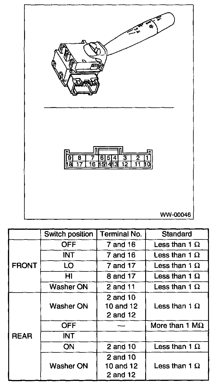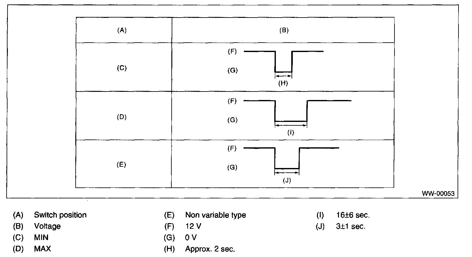 3. Apply battery voltage to switch terminals 16 and 2, and inspect the voltage of terminals 7 and 2. (Measure the voltage from after the second time the wiper stops.)
