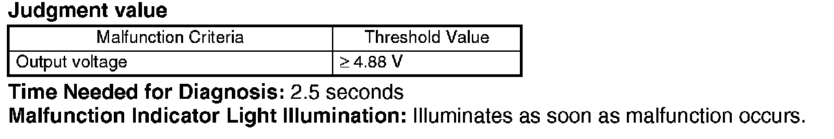 Judge NG when the continuous time until completing the malfunction criteria becomes more than the time (2.5 seconds) needed for diagnosis. Judge fail safe NG when the continuous time until completing the malfunction criteria becomes more than time (0.1 seconds) needed for diagnosis. Judge OK and clear the NG when the malfunction criteria are not completed.