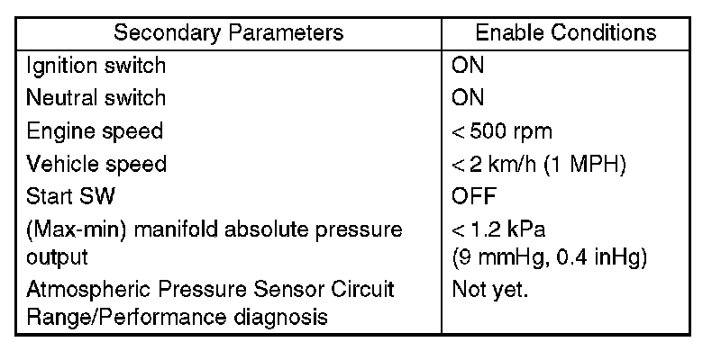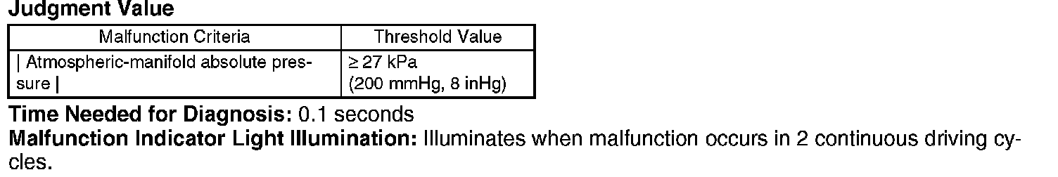 Detect the malfunction of atmospheric pressure sensor output property. Intake manifold pressure and atmospheric pressure are the same from turning the IG key to ON to turning the start SW to ON. Therefore, compare the pressure from intake manifold pressure and atmospheric pressure sensors, and then judge NG when their difference is large.