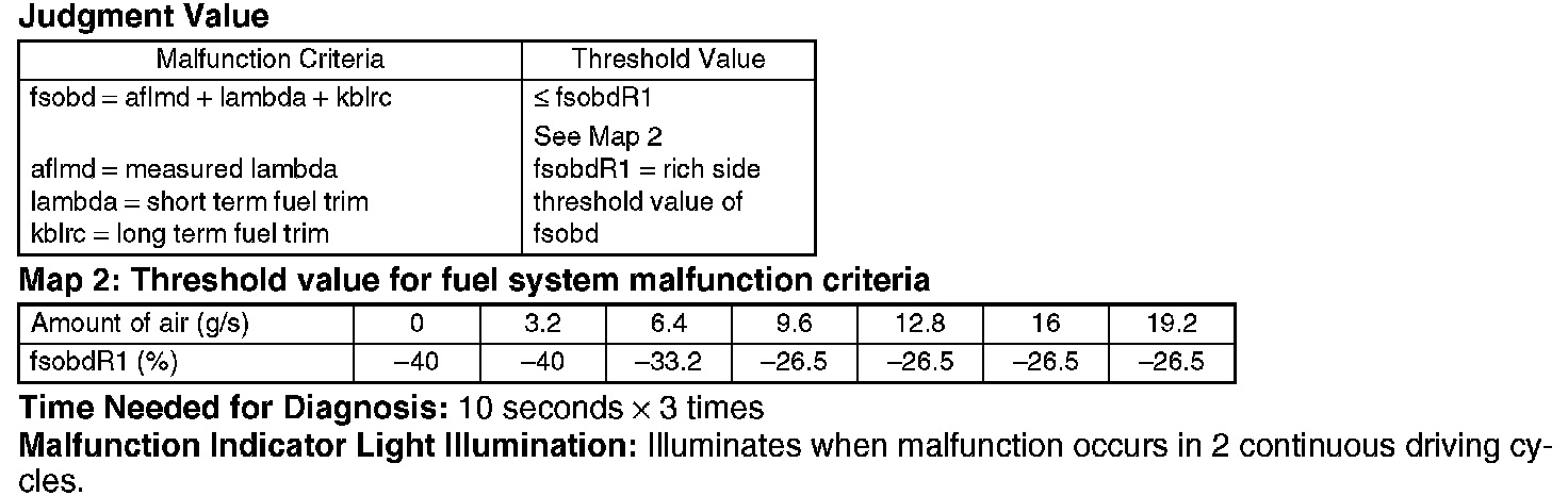 Judge that the malfunction occurred in fuel system when the malfunction criteria are completed for 30 seconds or more by comparing the diagnostic value (fsobd) with threshold value.