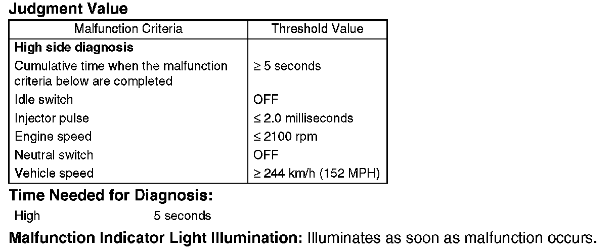 Judge NG when the time of completing the malfunction criteria becomes more than time needed for diagnosis. Judge OK when the vehicle speed is more than 4 km/h (2.5 MPH) and less than 224 km/h (140 MPH).