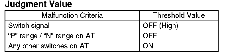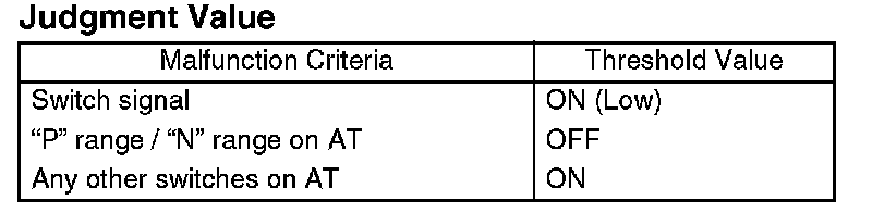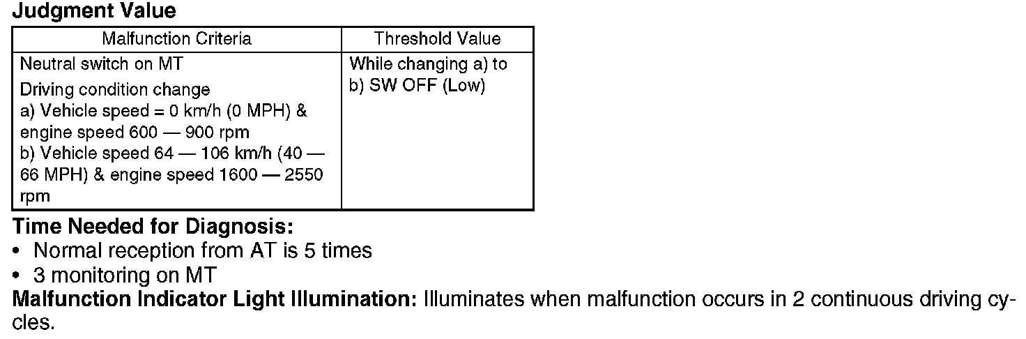 - MT: Judge NG when the neutral switch does not respond even though shift lever is changed (neutral switch is turned on or off by vehicle and engine speed).