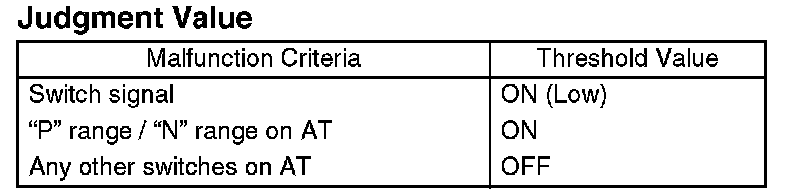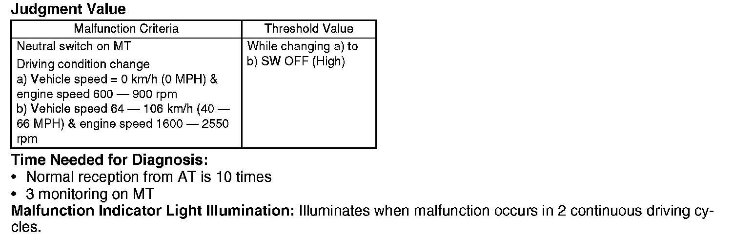 - MT: Judge NG when the neutral switch does not respond even though shift lever is changed (neutral switch is turned on or off by vehicle and engine speed).