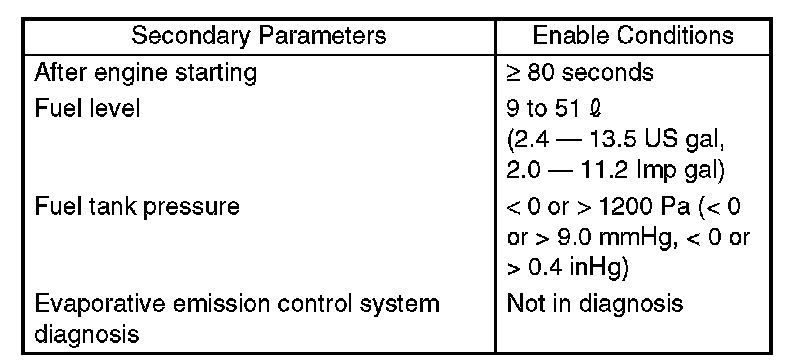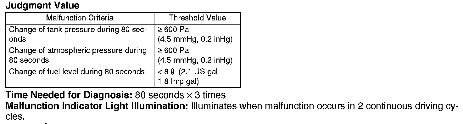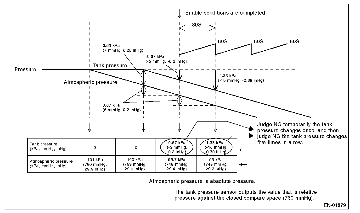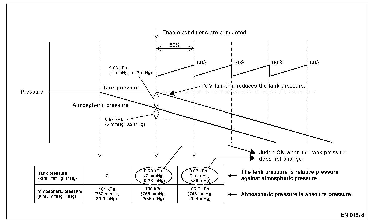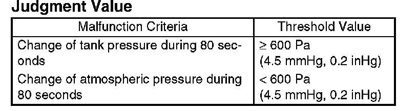 Judge OK when the fuel tank pressure does not change (or changes by less than 0.67 kPa (5 mmHg, 0.2 inHg)) at atmospheric pressure changing by 0.67 kPa (5 mmHg, 0.2 inHg) or more per 80 seconds.
