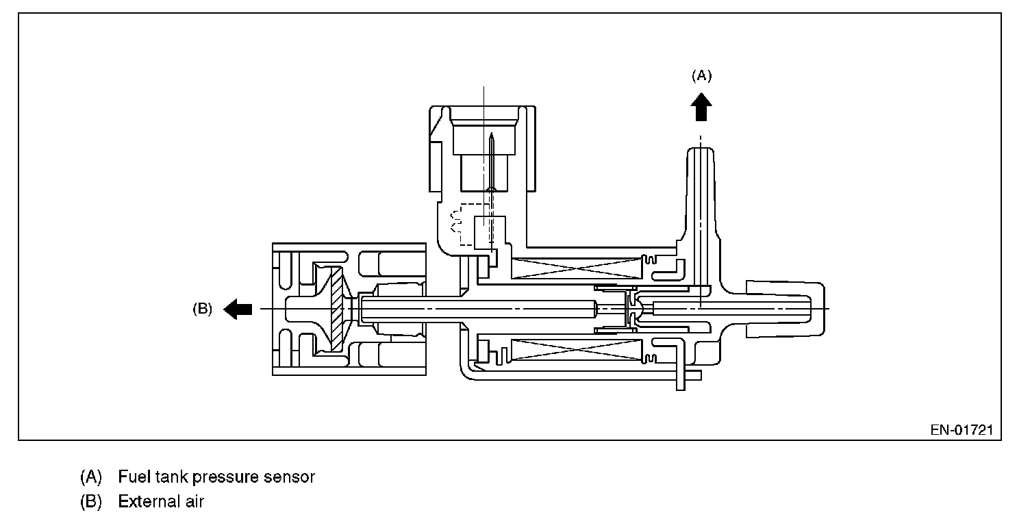 Detect the tank pressure switching solenoid function abnormality. The tank pressure sensor is a relative pressure sensor, which normally compares the pressure with the atmospheric pressure. The tank pressure switching solenoid is a solenoid, which shifts the compare space from opening to closed during the EVAP diagnosis. Detect the malfunction that the compare space remains closed. (Not judge NG after enable condition completed but assume NG before enable condition completed.)