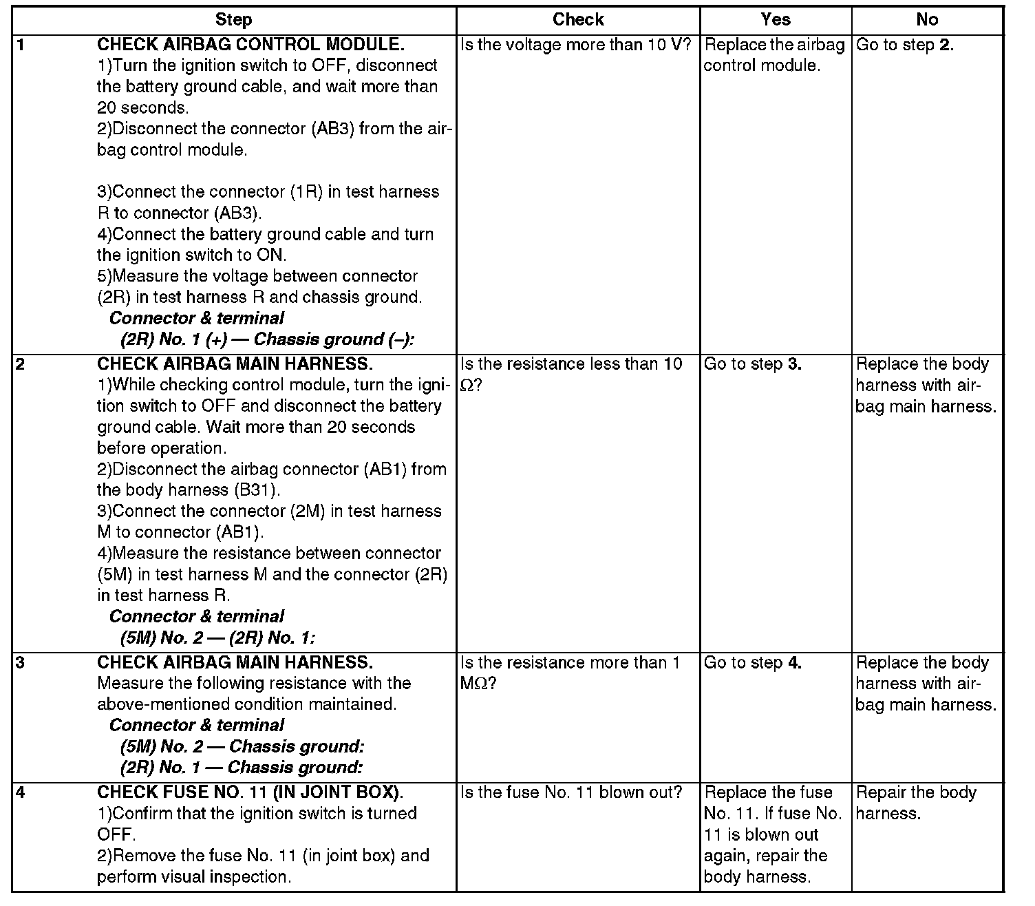 - When inspecting the airbag main harness, disconnect the driver's airbag module and passenger's airbag module connectors for safety reasons.