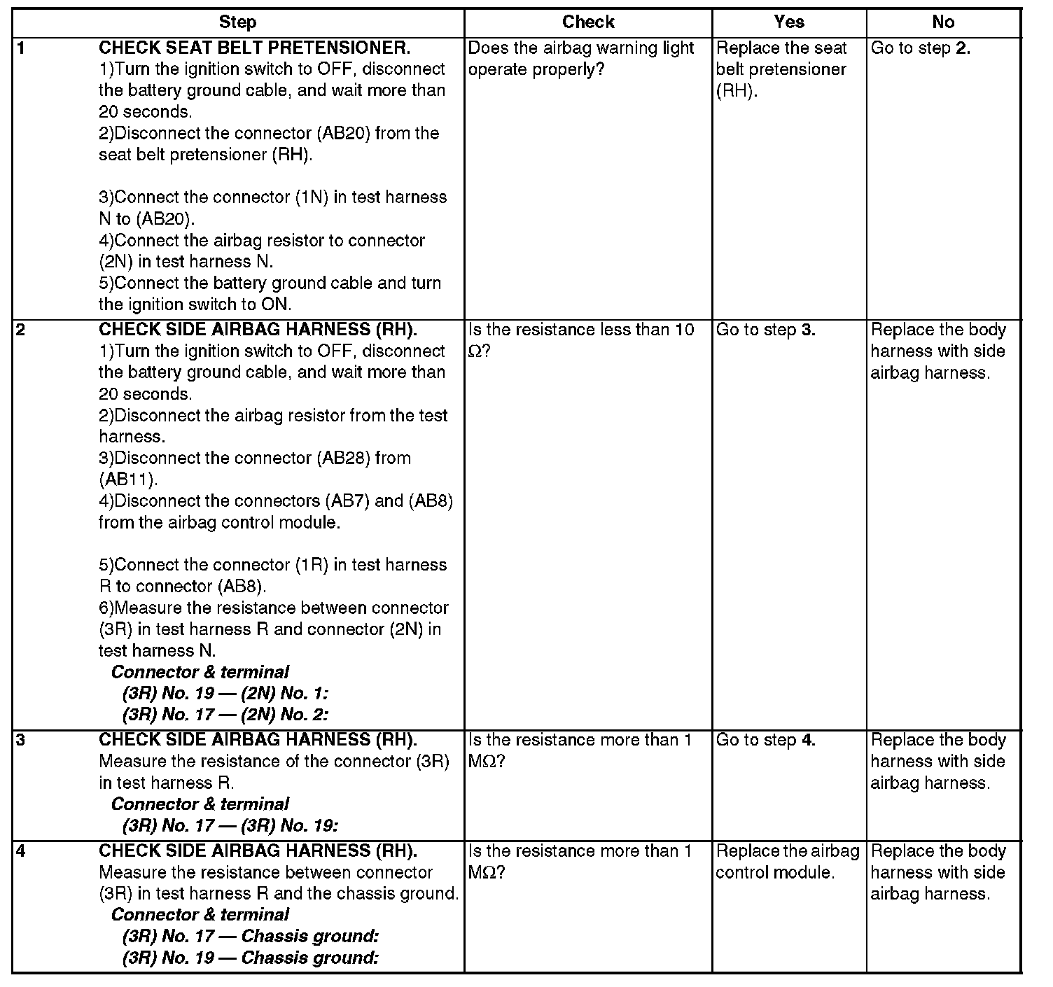 - When inspecting the side airbag harness, disconnect the side airbag module connector and seat belt pretensioner connector for the safety reasons.