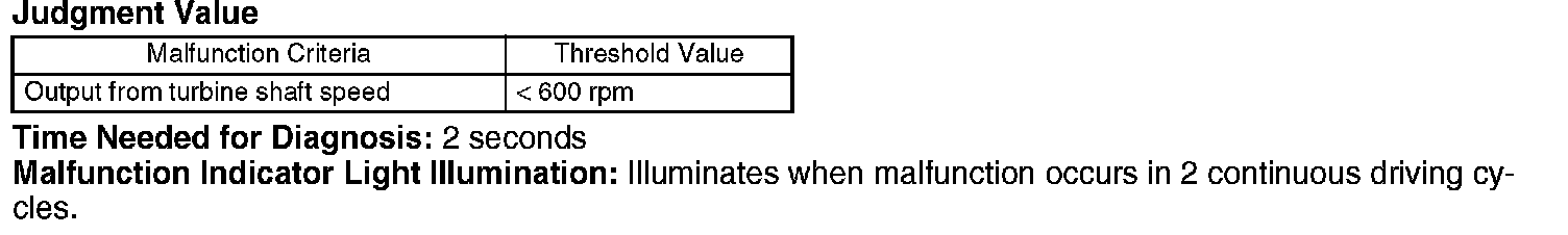 Torque converter turbine speed sensor (output shaft speed sensor) is installed to the outside of transmission case. This sensor detects the turbine speed of torque converter by the peripheral speed of high clutch drum connected to input shaft. And then it transmits the sine wave signal (32 pulses per rev.) to TCM. TCM calculates the ratio of the input shaft speed to vehicle speed, and then makes a judgment whether to shift or not.