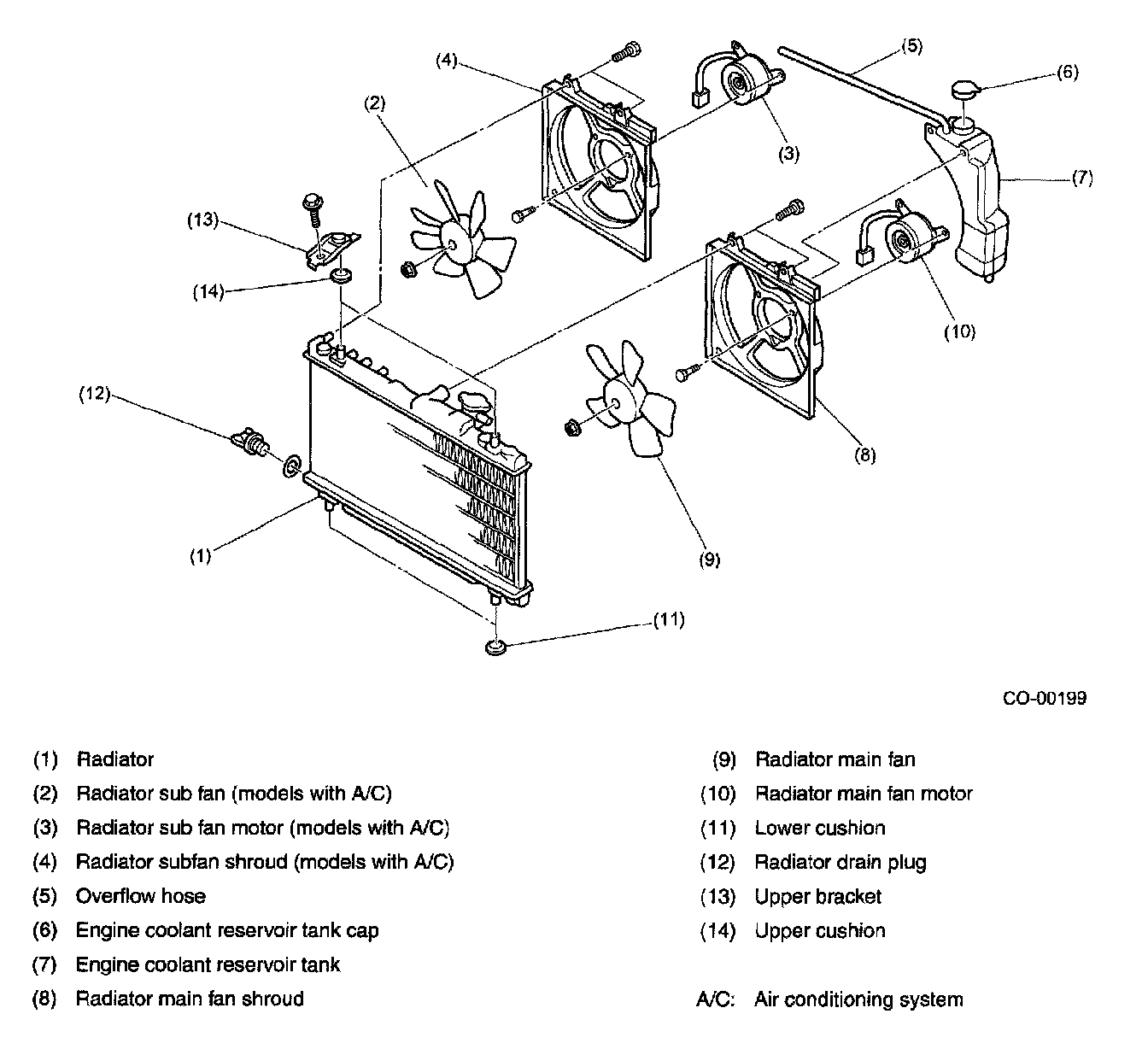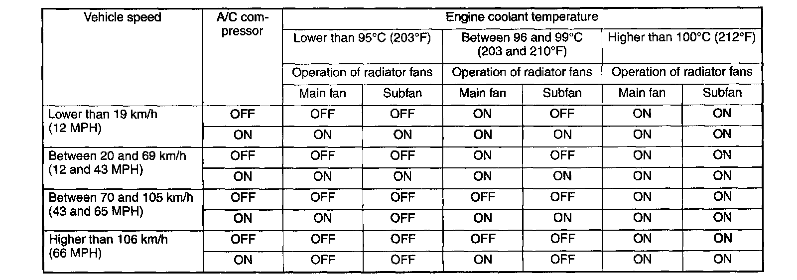 On models equipped with an air conditioning system, the ECM receives signals from the engine coolant temperature sensor, vehicle speed sensor and A/C switch, and according to these signals, the ECM turns ON or OFF the radiator main fan and sub fan simultaneously (and also selects the Hi or Low fan speed in turbo model).