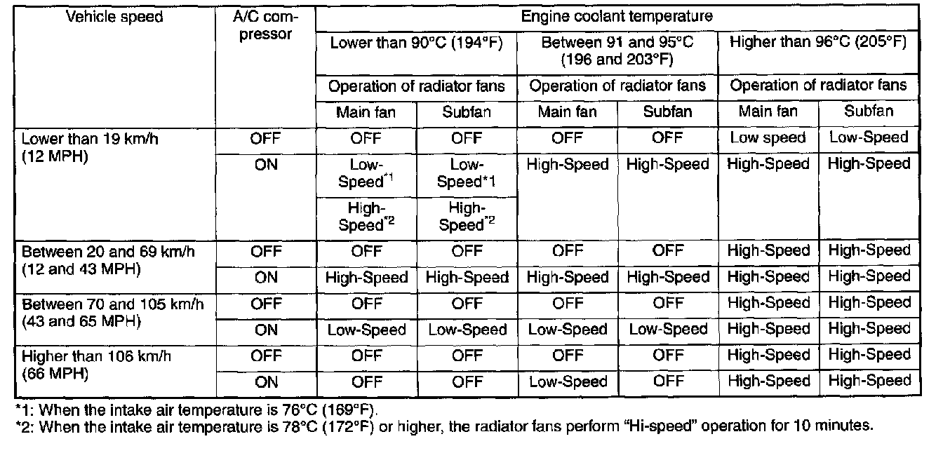 *2: When the intake air temperature is 78°C (1 72°F) or higher, the radiator fans perform "Hi-speed" operation for 10 minutes.