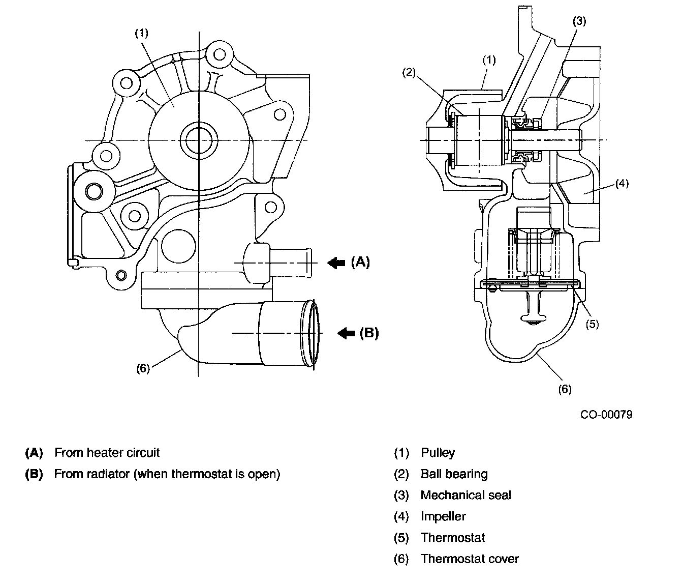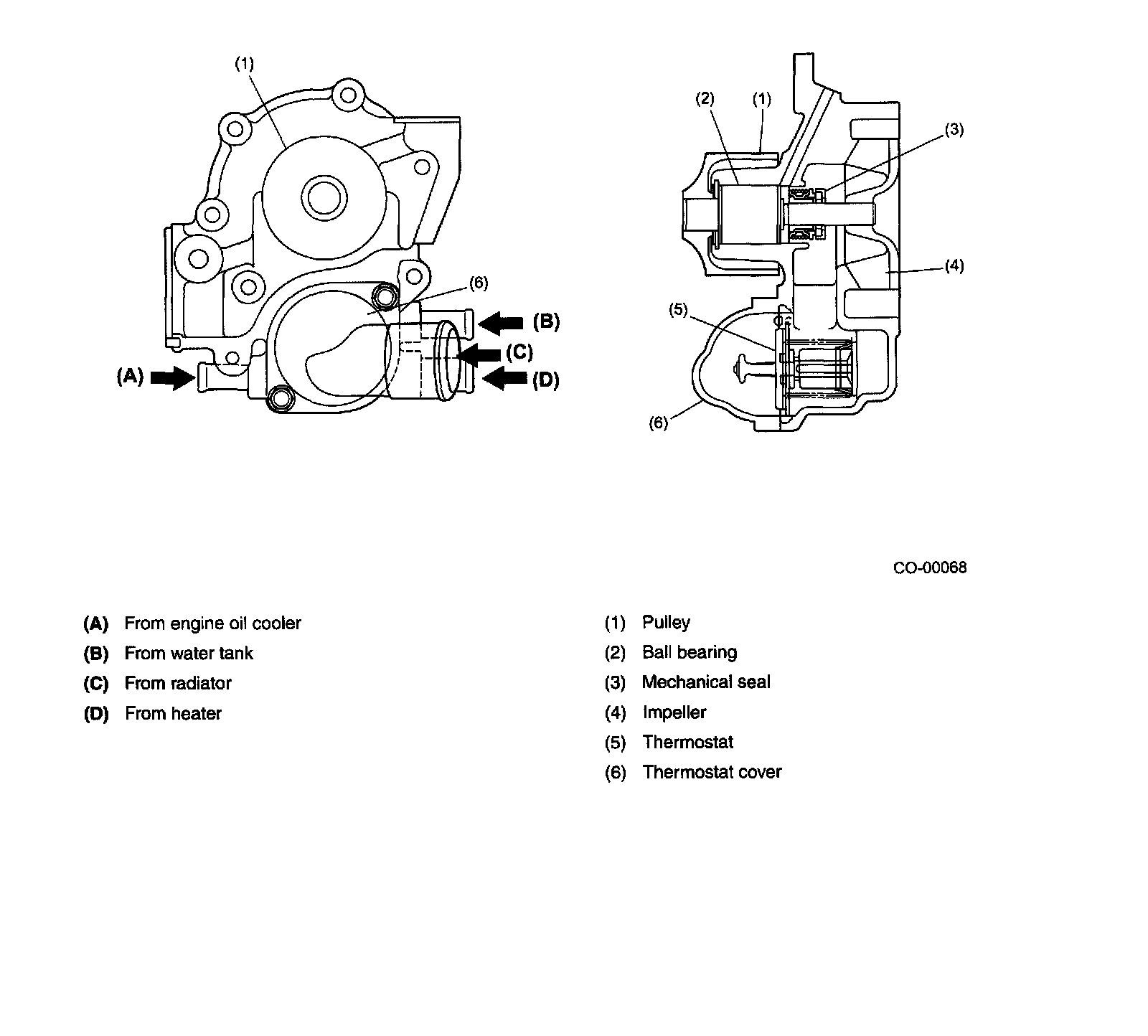 Water PumpThe water pump is located in the front portion of the left bank cylinder block and is driven by the engine through the timing belt. The thermostat is fitted into the coolant inlet at the bottom of the water pump. When the pump's impeller rotates, the coolant is drawn into the pump from the lower pipe (which is connected to the radiator hose) via the thermostat. It then flows along the perimeter of the impeller and then is discharged for circulation through a circuit depending on the coolant temperature.