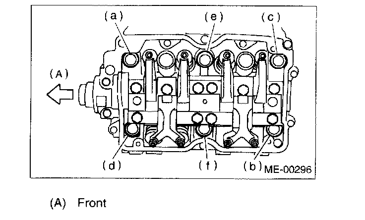 NOTE: Leave bolts (a) and (c) engaged by three or four threads to prevent cylinder head from falling.