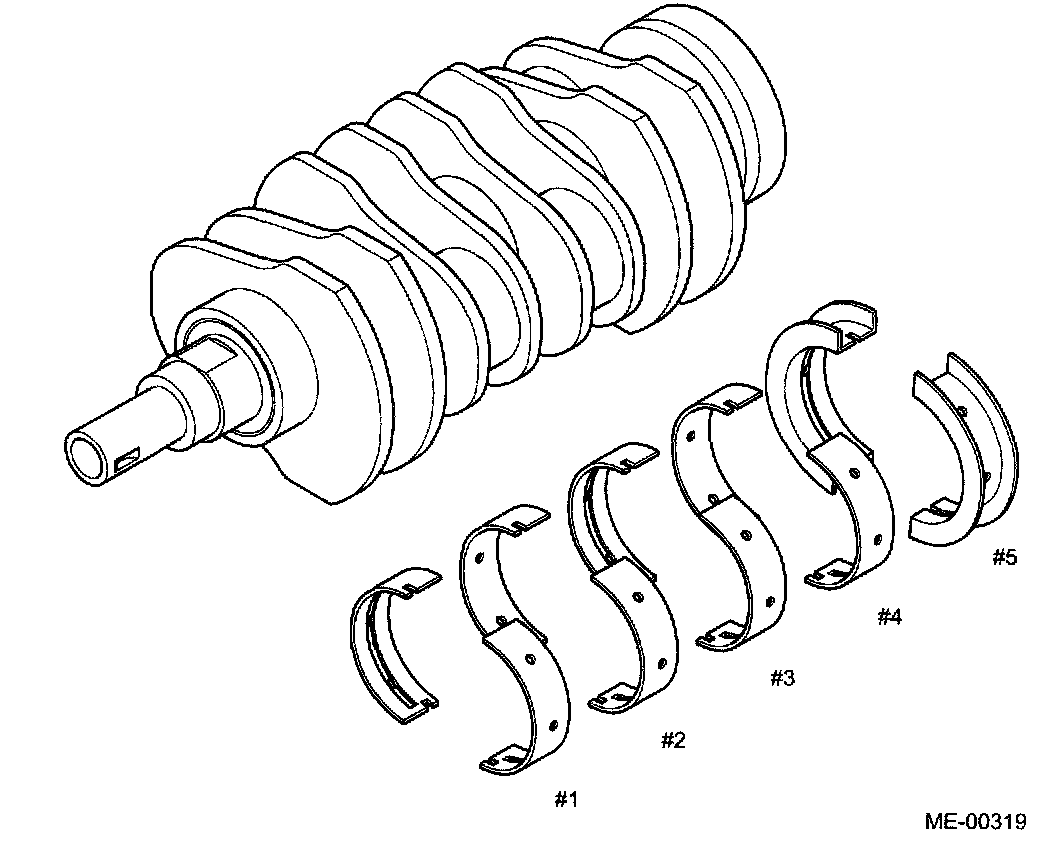 CrankshaftThe crankshaft is supported in the cylinder block by five bearings. Each corner formed by a journal or pin and a web is finished by fillet-rolling method which increases strength of that area. The five crankshaft bearings are made of aluminum alloy and the No. 5 bearing is provided with a flanged metal to support thrust forces.
