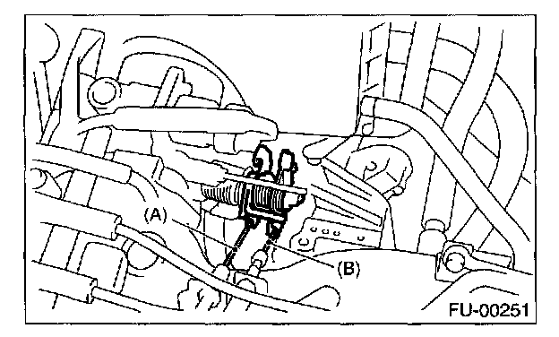 6. Disconnect the cruise control cable (B). (vehicles with cruise control)