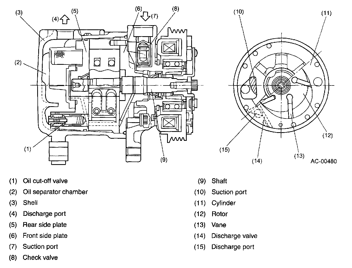 There is a check valve in the front housing to avoid reverse rotation of the compressor which would otherwise occur when the compressor is stopped.