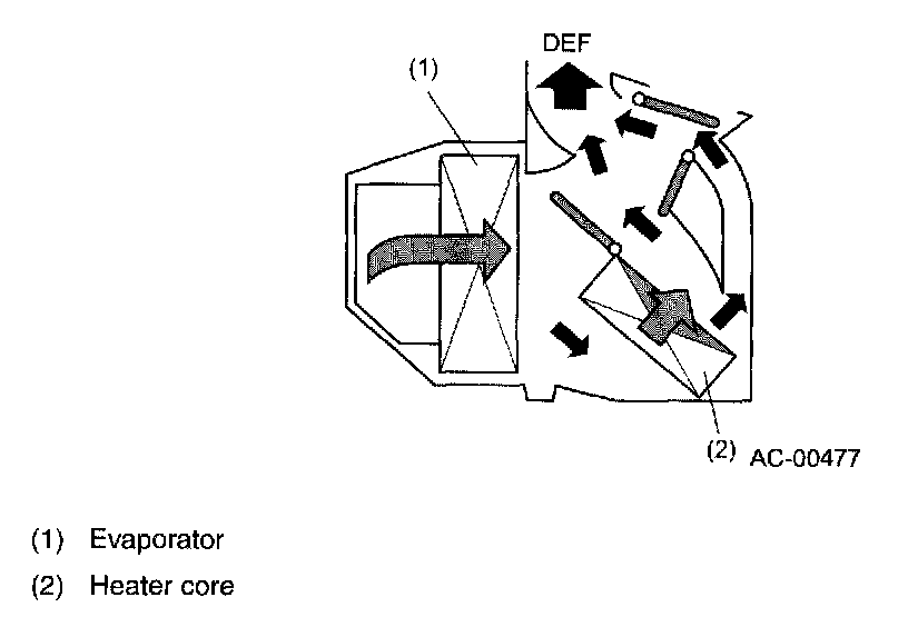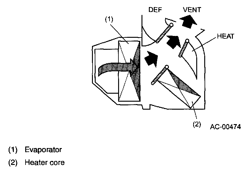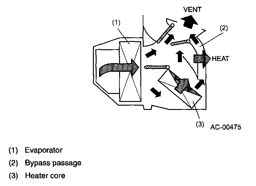 - When the air temperature is necessary to be adjusted, heated air is blown at right angles against the flow of cool air from the evaporator. This allows the airs to mix thoroughly.