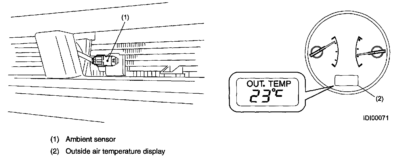 The outside air temperature display system consists of an ambient sensor, the CUSTOM CPU and a liquid crystal display installed in the combination meter. The ambient sensor detects the outside air temperature using the built-in thermistor which varies its resistance according to change in ambient temperature, and sends signals to the CUSTOM CPU.