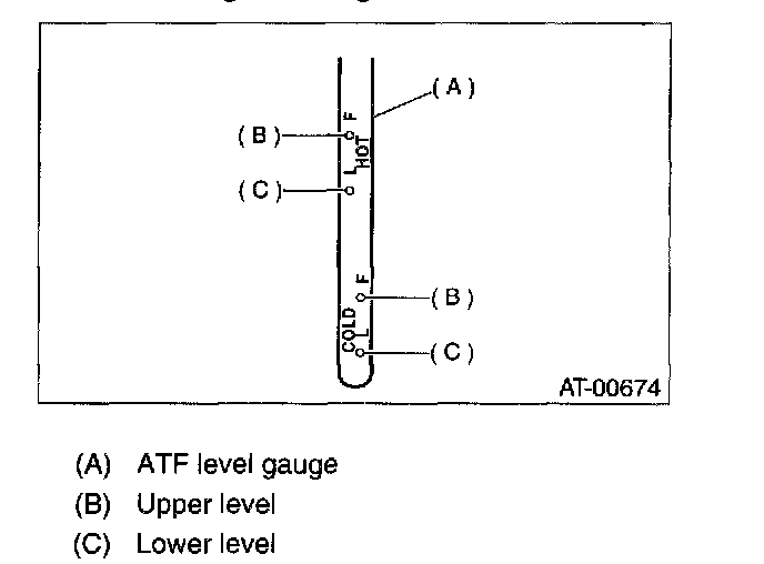 NOTE: When the transmission is hot, the level should be above the center of upper and lower marks, and when it is cold, the level should be found below the center of these two marks.