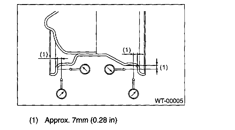 4. If the rim runout exceeds specifications, remove the tire from rim and check runout while attaching dial gauge to positions shown in figure.