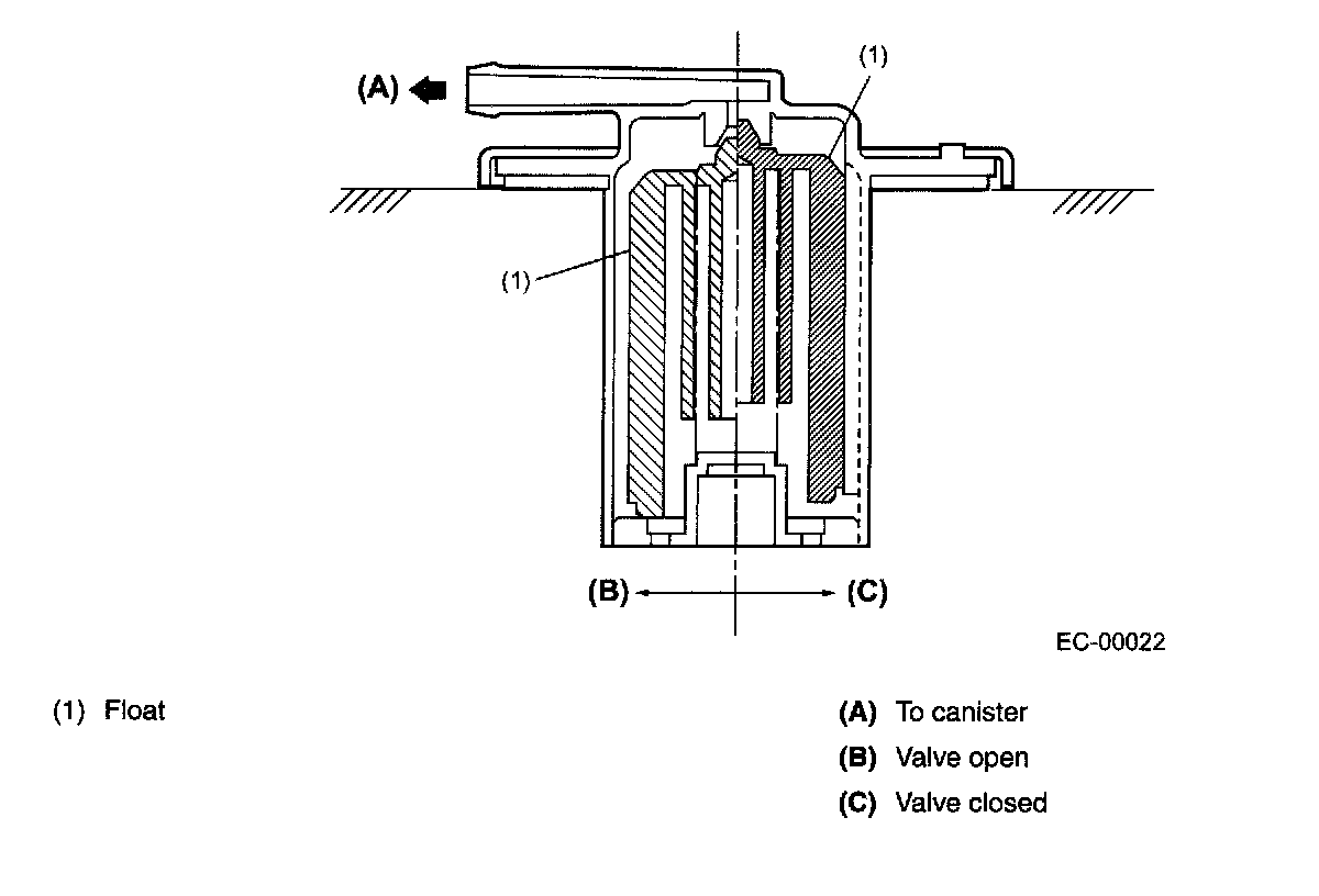 . The rising level of the fuel in the fuel tank causes the float to move up and close the cap hole so that no fuel can flow to the evaporation line.