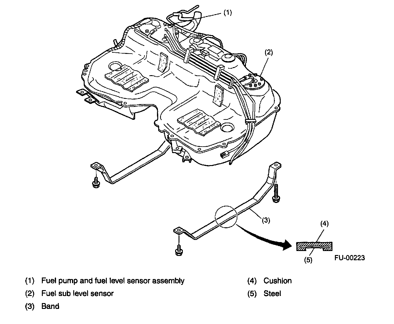 FUEL TANKThe fuel tank utilizes a two-compartment design to ensure sufficient capacity without interfering with the rear differential. It is provided with a suction jet pump (included in the fuel pump and fuel level sensor assembly) which transfers fuel from one compartment to the other. Each compartment has an individual fuel level sensor.