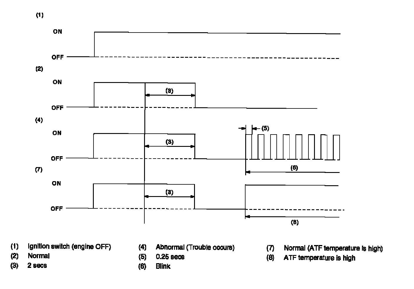 INSPECTIONWhen any on-board diagnostics item is malfunctioning, the display on AT OIL TEMP warning light blinks from the time malfunction is detected after starling the engine until ignition switch is turned to OFF. The malfunctioning part or unit can be determined by a DTC during on-board diagnostics operation. Problems which occurred previously can also be identified through the memory function. If the AT OIL TEMP warning light does not show a problem (although a problem is occurring), the problem can be determined by checking the performance characteristics of each sensor using select monitor. The AT OIL TEMP warning light signal is as shown in the figure.